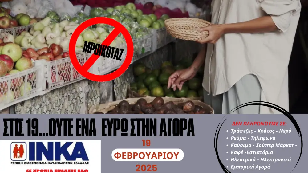 Το ΙΝΚΑ, Γενική Ομοσπονδία Καταναλωτών Ελλάδας, καλεί τους πολίτες την Τετάρτη 19 Φεβρουαρίου 2025 να μην ξοδέψουν ούτε καν 1 ευρώ στην αγορά.