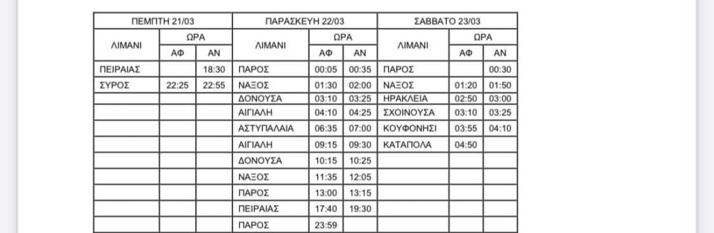 Λόγω δυσμενών καιρικών συνθηκών, με αποτέλεσμα την καθυστέρηση του πλοίου στον λιμένα του Πειραιά, τα δρομολόγια του πλοίου από σήμερα Πέμπτη 21έως Σάββατο 23 Μαρτίου, θα διαμορφωθούν, ως ακολούθως: