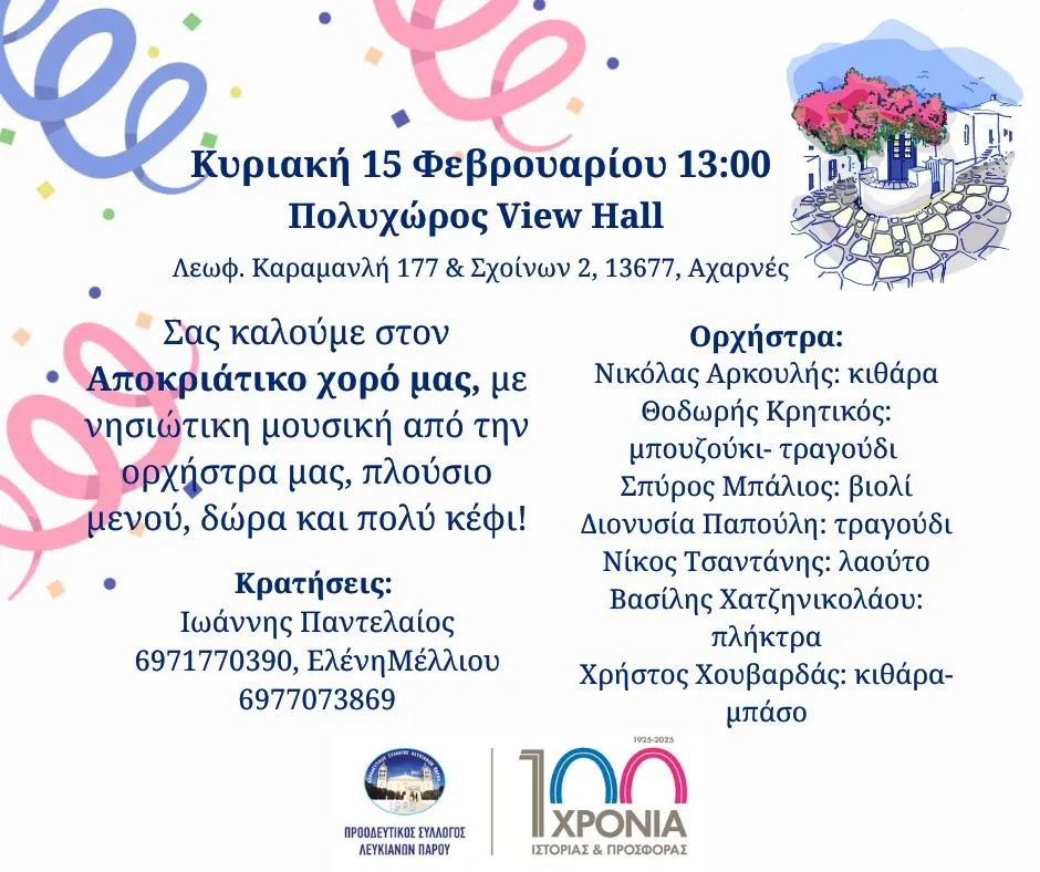 Αποκριάτικο χορό διοργανώνει ο Προοδευτικός Σύλλογος Λευκιανών Πάρου στον πολυχώρο View Hall, επί της λεωφόρου Καραμανλή 177 στις Αχαρνές.