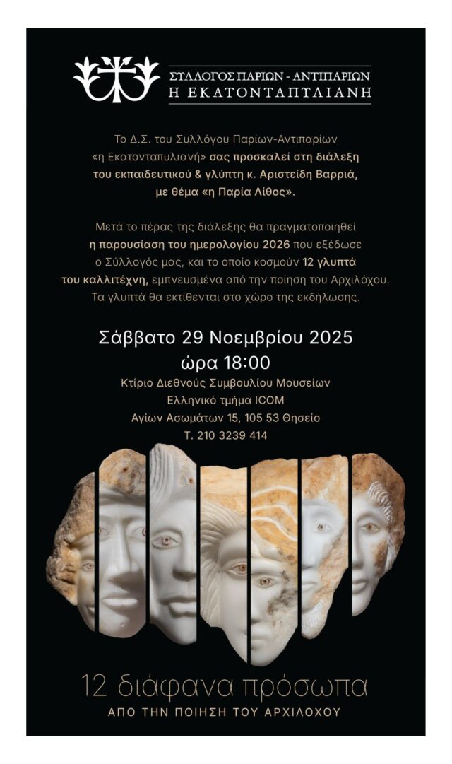 Εκδήλωση με τίτλο: «12 διάφανα πρόσωπα» και διάλεξη του εκπαιδευτικού και γλύπτη Αριστείδη Βαρριά με θέμα: «Η Παρία Λίθος» διοργανώνει το ΔΣ του Συλλόγου Παρίων – Αντιπαρίων «Η Εκατονταπυλιανή» το Σάββατο 29 Νοεμβρίου 2025 στις 6 μ.μ. στο κτίριο του Διεθνούς Συμβουλίου Μουσείων (ελληνικό τμήμα ICOMστο Θησείο (Αγίων Ασωμάτων 15) στην Αθήνα.