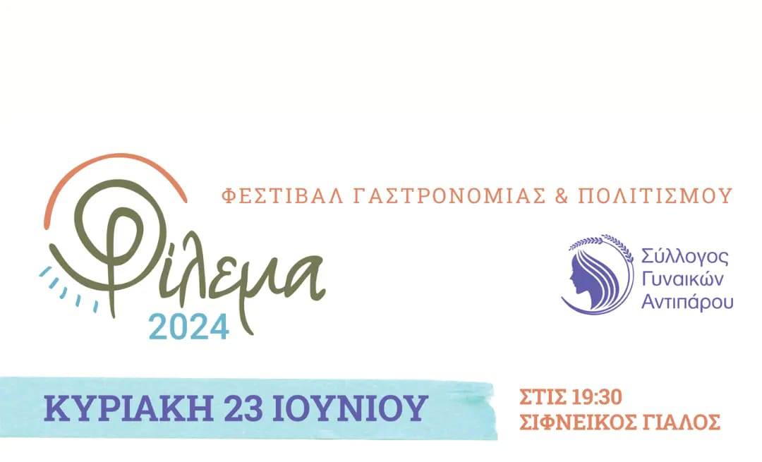 Ο σύλλογος γυναικών Αντιπάρου, υπό την αιγίδα του δήμου Αντιπάρου, διοργανώνει την Κυριακή, 23 Ιουνίου, στον Σιφνέικο Γιαλό, την εκδήλωση «Φίλεμα 2024».