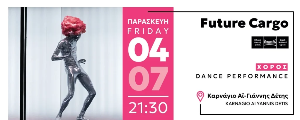 Το Μπαλέτο της Εθνικής Λυρικής Σκηνής, σε συμπαραγωγή με το φημισμένο The Place του Λονδίνου, παρουσιάζουν το «Future Cargo» την Παρασκευή 4 Ιουλίου 2025, 21:30 στο Καρνάγιο του Άι-Γιάννη Δέτη, μια παράσταση χορού επιστημονικής φαντασίας, εκτυλισσόμενη σε ένα φορτηγό ύψους 12 μέτρων.