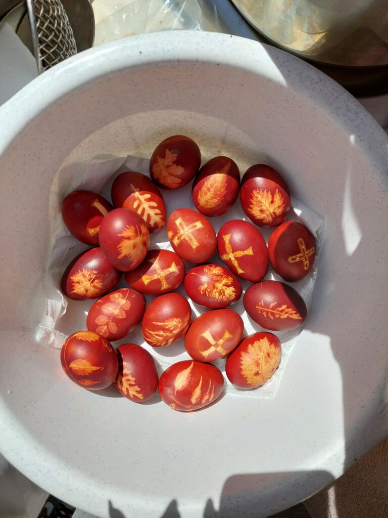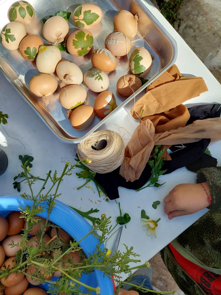Έτσι, σήμερα το πρωί, μικροί και μεγάλοι, συγκεντρώθηκαν στον αυλόγυρο της εκκλησίας του Αγίου Νικολάου για να βάψουν τα αυγά. Ο τρόπος βαψίματος των αυγών και τα σχέδια που μπαίνουν πάνω τους από φύλλα του αγρού γίνεται με τον παραδοσιακό τρόπο.