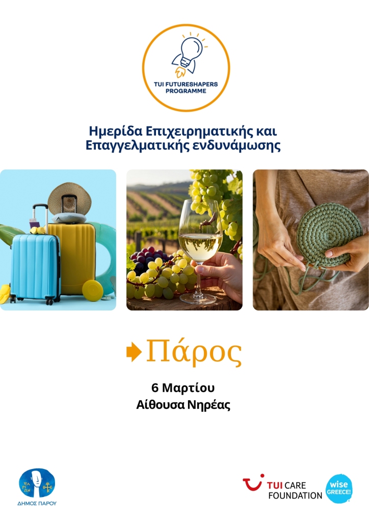 Η Wise Greece, με την υποστήριξη του TUI Care Foundation και σε συνεργασία με τον Δήμο Πάρου, σας προσκαλεί στην Ημερίδα Επιχειρηματικής και Επαγγελματικής Ενδυνάμωσης – μια μοναδική ευκαιρία για επαγγελματίες ή επιχειρηματίες να ενισχύσουν τις γνώσεις και τις δεξιότητές τους.