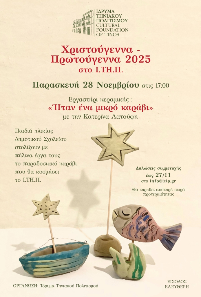 Το Διοικητικό Συμβούλιο του Ιδρύματος Τηνιακού Πολιτισμού προσκαλεί παιδιά Δημοτικού στο γιορτινό εργαστήρι κεραμικής «Ήταν ένα μικρό καράβι», που θα πραγματοποιηθεί την Παρασκευή 28 Νοεμβρίου 2025.