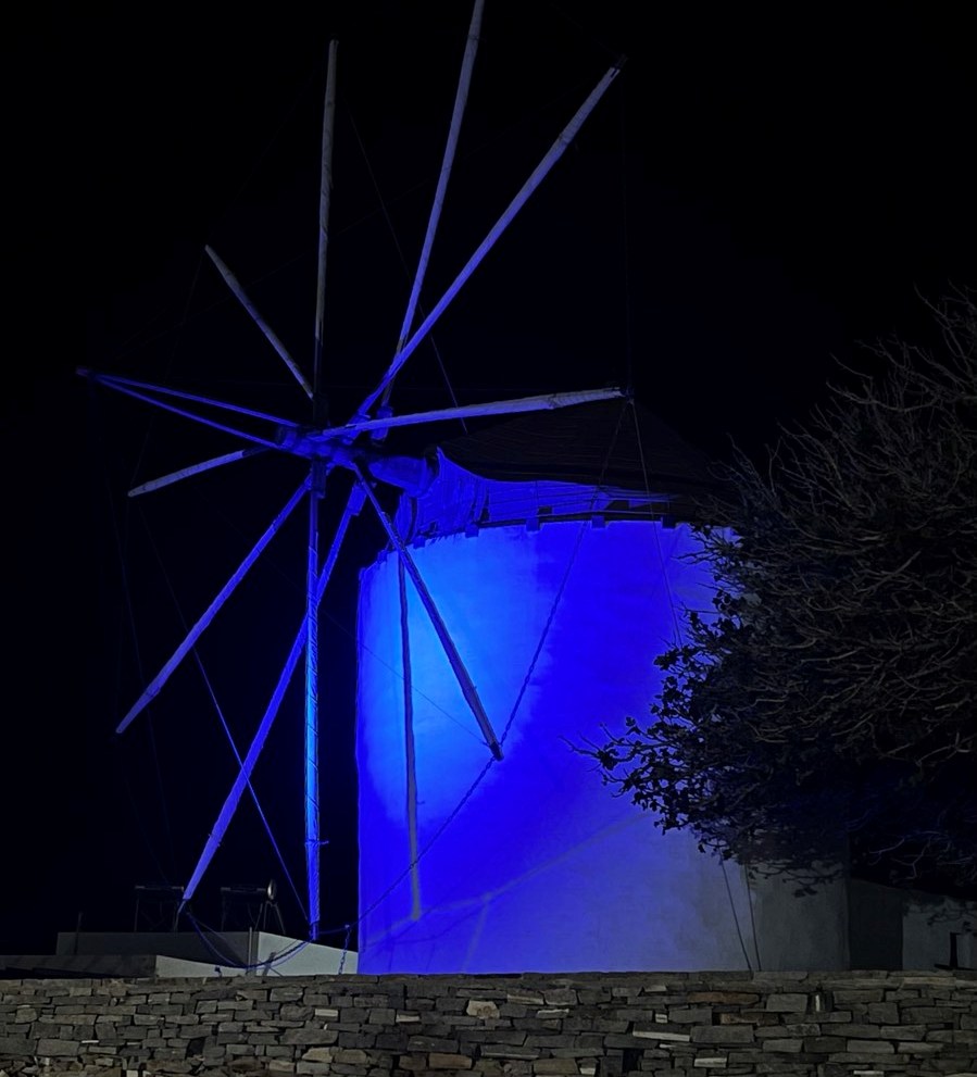 Συγκεκριμένα, το βράδυ της 29ης Απριλίου, ο μύλος στον λόφο της Αγίας Άννας, δίπλα στο δημαρχείο Πάρου «φωτίστηκε» στις μπλε αποχρώσεις του Make-A-Wish, συμβάλλοντας στη διάδοση του οράματος του οργανισμού: να φτάσει σε ΟΛΑ τα παιδιά που νοσούν από μία σοβαρή ασθένεια και έχουν ανάγκη από την εκπλήρωση της ευχής τους.