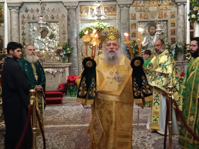 Στο τέλος της Θείας Λειτουργίας, ο Σεβασμιώτατος απηύθυνε προς τους κληρικούς και τους πιστούς πατρικές εόρτιες ευχές και εν συνεχεία διένειμε το αντίδωρο.