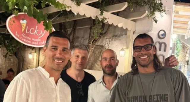 Ο Γιώργος Πρίντεζης, ο Βασίλης Σπανούλης, ο Θοδωρής Παπαλουκάς και ο Νίκος Ζήσης συναντήθηκαν στο κυκλαδίτικο νησί και απαθανάτισαν την στιγμή με μια φωτογραφία.