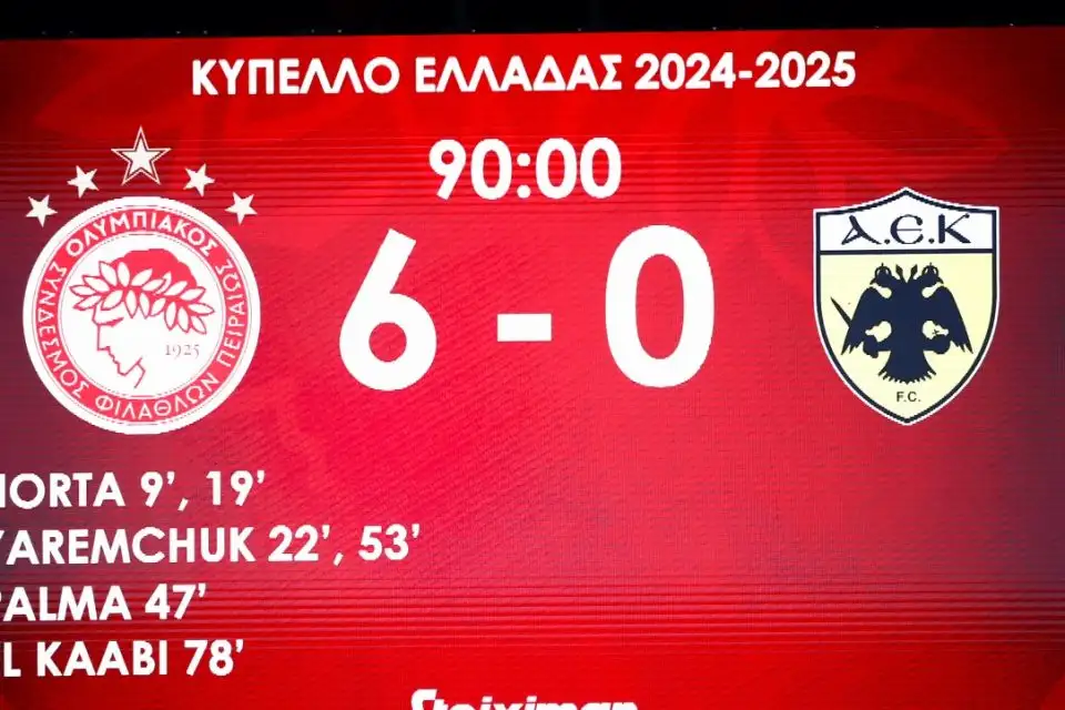 Πάρτι έστησε ο Ολυμπιακός απέναντι στην ΑΕΚ με το εκκωφαντικό 6-0, για τα ημιτελικά του Κυπέλλου Ελλάδας.