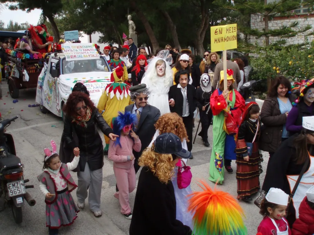 «Τα τελευταία χρόνια καθιερώθηκε και το καρναβάλι την Καθαρά Δευτέρα», τονίζει. «Όπως παντού, στο τραπέζι υπήρχαν θαλασσινά και λαγάνες• παλιότερα έβγαιναν για αχινούς και πίνες από το βράδυ, μάζευαν κοχύλια, χταπόδια, καλαμάρια – όλα ντόπια. Το ψήσιμο, η τσικουδιά και το κρασί έδιναν τον τόνο της μέρας. Το απόγευμα, γύρω στις 5 μ.μ., εμφανίζονταν οι μασκαράδες και τα αυτοσχέδια άρματα – συχνά πάνω σε τρακτέρ ή αυτοκίνητα – πολλά από τα οποία είχαν και μουσική. Χόρευαν πάνω στα οχήματα αλλά και στον δρόμο, με τον κόσμο να συμμετέχει αυθόρμητα. Τα θέματα των αρμάτων εμπνέονταν από την επικαιρότητα – από τη «φραπελιά» το Βατοπέδι, τον Καλλικράτη, και το ΕΣΥ μέχρι τον πόλεμο στην Ουκρανία. Η πορεία ξεκινούσε από το λιμάνι και κατέληγε στην πλατεία του χωριού. Εκεί μαζευόταν ο κόσμος, έμπαινε η μουσική από το κεντρικό καφενείο της πλατείας και το γλέντι κρατούσε μέχρι αργά. Χόρευαν ντόπιοι και επισκέπτες από την Πάρος, μικροί και μεγάλοι, σε μια γιορτή απλή, λαϊκή, με βασικό στοιχείο το αυθόρμητο».