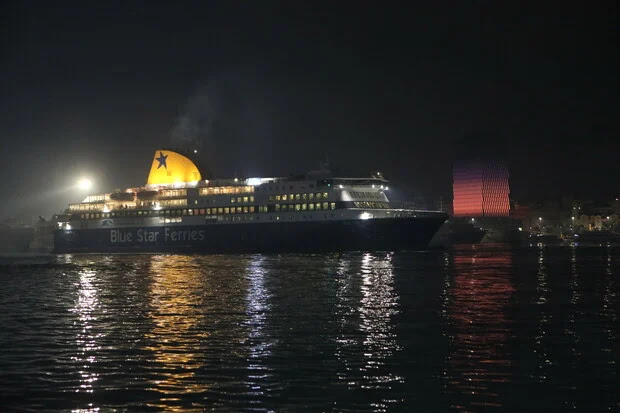 Το Blue Star Delos μπήκε στο μεγαλύτερο λιμάνι της χώρας λίγο μετά τα μεσάνυχτα, ερχόμενο από Σαντορίνη, Νάξο και Πάρο.