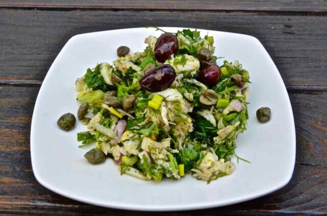 3. Βάζουμε σε ένα μεγάλο μπολ τα κομμάτια από το σαλάχι και ρίχνουμε από πάνω τον άνηθο, το μαϊντανό και την κάπαρη.