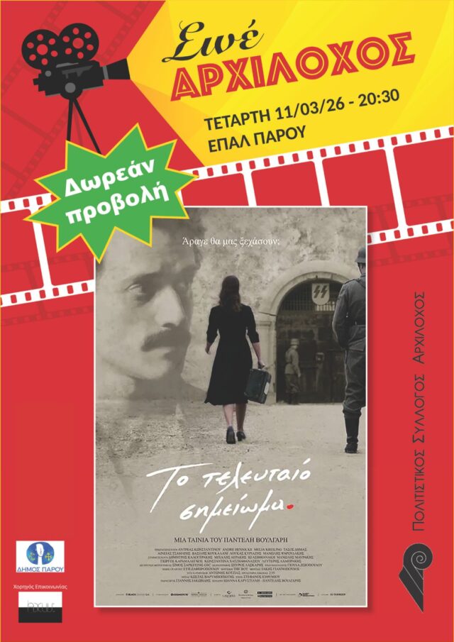Αυτή την Τετάρτη 11 Μαρτίου, η Κινηματογραφική Λέσχη του Αρχίλοχου βάζει μια άνω τελεία στις φετινές της προβολές. Η τελευταία προβολή, πριν ξαναπιάσουμε το νήμα το φθινόπωρο, θα είναι η ταινία του Παντελή Βούλγαρη «Το Τελευταίο Σημείωμα», στις 20:30, στο ΕΠΑΛ.