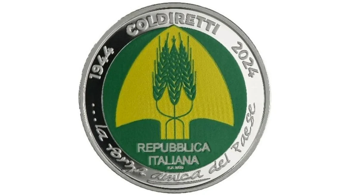 Η «COLDIRETTI» πλαισιώνεται από τις ημερομηνίες «1944» και «2024», για να υπογραμμιστεί η επέτειος που γιορτάζεται. Υπάρχει ακόμη η φράση «…la forza amica del Paese», χαραγμένη με πλάγια γράμματα.