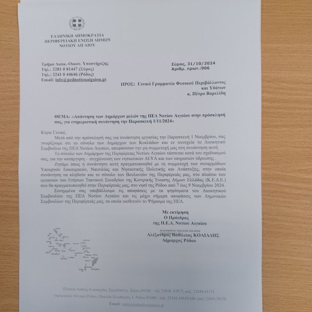 Η ΠΕΔ Ν. Αιγαίου, σε επιστολή της προς τον κ. Βαρελίδη, σημειώνει: «[…] Το σύνολο των δημάρχων της Περιφέρειας Νοτίου Αιγαίου τάσσεται κατά του σχεδιασμού σας, για την κατάργηση – συγχώνευση των νησιωτικών Δ.Ε.Υ.Α. και των υπηρεσιών ύδρευσης.