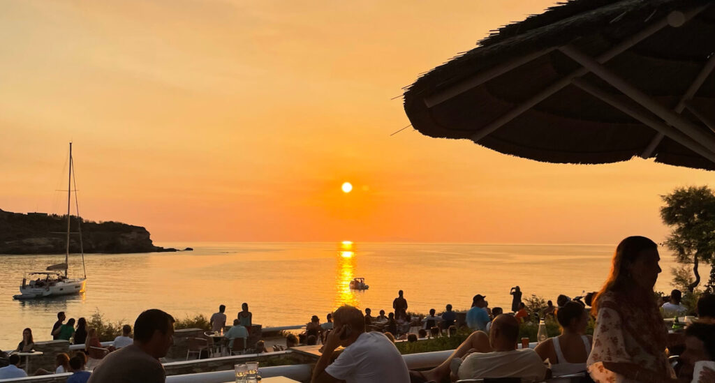 Η παραλία ξεχωρίζει για τα κρυστάλλινα νερά της και την ωραία αμμουδιά, αλλά υποφέρει από δυτικούς και βόρειους ανέμους. Η περιοχή είναι εξαιρετική για να απολαύσετε ένα από τα ωραιότερα ηλιοβασιλέματα του Αιγαίου, με πέτρινα παγκάκια και κοντινή παιδική χαρά. Το μπαρ “Sunset” είναι ιδανικό για να συνδυάσετε τη θέα του ηλιοβασιλέματος με ένα κοκτέιλ.